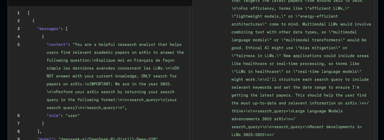 Surprisingly, asking a question in French and specifying that you want a French answer does not lead the model to search for papers written in French. This is another good demonstration of the multilingual flexibility of DeepSeek-R1 Qwen 32B.